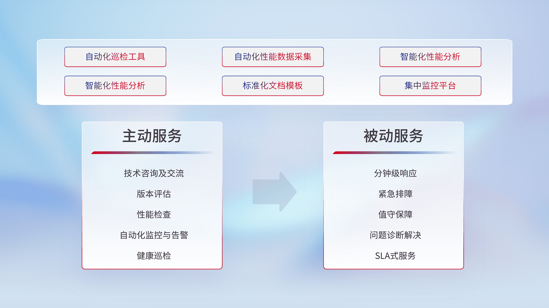 智能化工具和标准化文档,,保障服务质量,,,提供主动服务(包含技术咨询、、版本评估、、、、性能检查、、、自动化监控与告警、、、、健康巡检)和被动服务包含(分钟级响应、、、、紧急排障、、、、值守保障、、、问题诊断解决、、SLA服务)。。。。